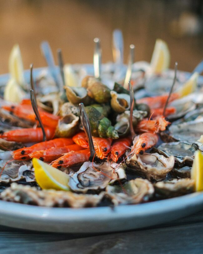 Plateaux de fruits de mer : crevettes, bulots, langoustines, palourdes…